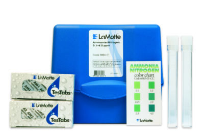 In this Ammonia Nitrogen test kit, salicylate reacts to form a blue color and levels are determined using the ColorRuler. Range and sensitivity is 0.0 – 4.0 ppm NH3-N.
