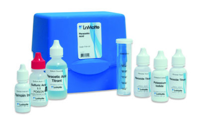 This peracetic acid test kit tests for peracetic acid and hydrogen peroxide using the dropper bottle method. Range/sensitivity is 1 drop = 50 ppm peroxide and 1 drop = 15 ppm peracetic acid.